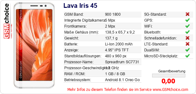 Hast du eigene Webseite? Willst du die Informationen über Standarddaten des Handys Lava Iris 45 irgendwo veröffentlichen? Das ist sehr einfach. Du kannst das Bild herunterladen oder kopieren und auf der Webseite folgenden Code hinzufügen:Das Einfügen von diesem Code verursacht das Anzeigen von dem folgenden Bild: