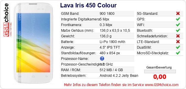 Daten des Mobiltelefons Lava Iris 450 Colour auf Ihrer Seite