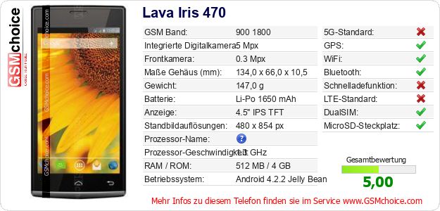 Hast du eigene Webseite? Willst du die Informationen über Standarddaten des Handys Lava Iris 470 irgendwo veröffentlichen? Das ist sehr einfach. Du kannst das Bild herunterladen oder kopieren und auf der Webseite folgenden Code hinzufügen:Das Einfügen von diesem Code verursacht das Anzeigen von dem folgenden Bild: