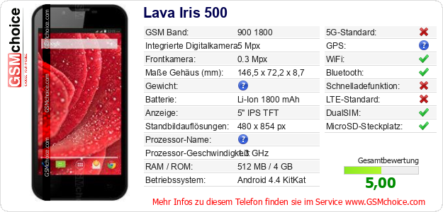 Hast du eigene Webseite? Willst du die Informationen über Standarddaten des Handys Lava Iris 500 irgendwo veröffentlichen? Das ist sehr einfach. Du kannst das Bild herunterladen oder kopieren und auf der Webseite folgenden Code hinzufügen:Das Einfügen von diesem Code verursacht das Anzeigen von dem folgenden Bild: