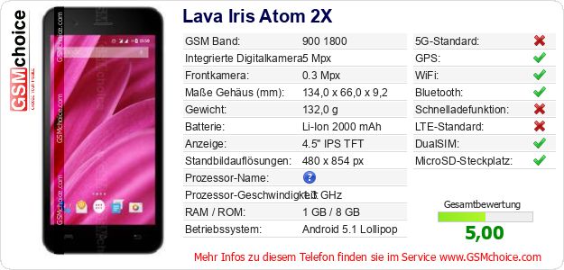 Hast du eigene Webseite? Willst du die Informationen über Standarddaten des Handys Lava Iris Atom 2X irgendwo veröffentlichen? Das ist sehr einfach. Du kannst das Bild herunterladen oder kopieren und auf der Webseite folgenden Code hinzufügen:Das Einfügen von diesem Code verursacht das Anzeigen von dem folgenden Bild: