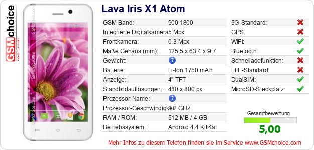 Daten des Mobiltelefons Lava Iris X1 Atom auf Ihrer Seite