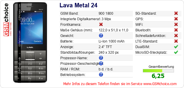 Hast du eigene Webseite? Willst du die Informationen über Standarddaten des Handys Lava Metal 24 irgendwo veröffentlichen? Das ist sehr einfach. Du kannst das Bild herunterladen oder kopieren und auf der Webseite folgenden Code hinzufügen:Das Einfügen von diesem Code verursacht das Anzeigen von dem folgenden Bild: