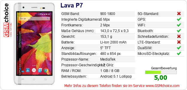 Hast du eigene Webseite? Willst du die Informationen über Standarddaten des Handys Lava P7 irgendwo veröffentlichen? Das ist sehr einfach. Du kannst das Bild herunterladen oder kopieren und auf der Webseite folgenden Code hinzufügen:Das Einfügen von diesem Code verursacht das Anzeigen von dem folgenden Bild: