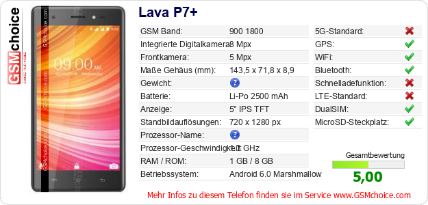 Hast du eigene Webseite? Willst du die Informationen über Standarddaten des Handys Lava P7+ irgendwo veröffentlichen? Das ist sehr einfach. Du kannst das Bild herunterladen oder kopieren und auf der Webseite folgenden Code hinzufügen:Das Einfügen von diesem Code verursacht das Anzeigen von dem folgenden Bild: