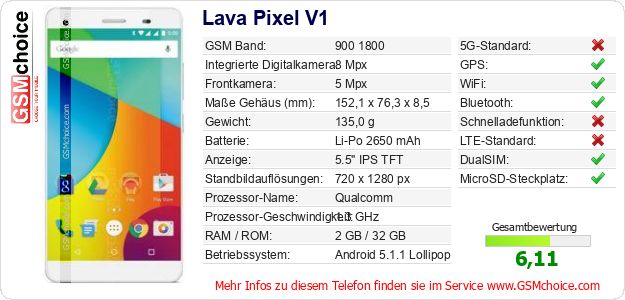 Hast du eigene Webseite? Willst du die Informationen über Standarddaten des Handys Lava Pixel V1 irgendwo veröffentlichen? Das ist sehr einfach. Du kannst das Bild herunterladen oder kopieren und auf der Webseite folgenden Code hinzufügen:Das Einfügen von diesem Code verursacht das Anzeigen von dem folgenden Bild: