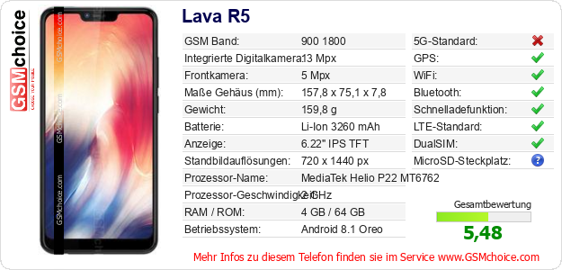Hast du eigene Webseite? Willst du die Informationen über Standarddaten des Handys Lava R5 irgendwo veröffentlichen? Das ist sehr einfach. Du kannst das Bild herunterladen oder kopieren und auf der Webseite folgenden Code hinzufügen:Das Einfügen von diesem Code verursacht das Anzeigen von dem folgenden Bild: