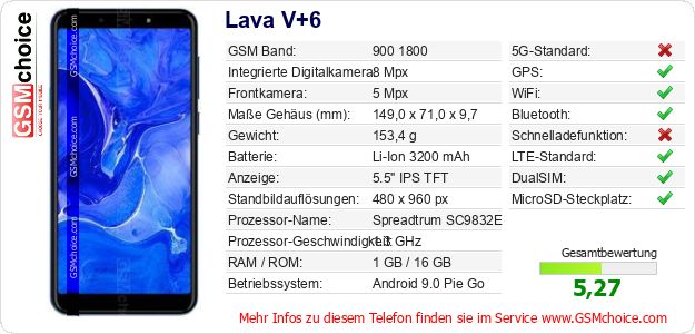 Hast du eigene Webseite? Willst du die Informationen über Standarddaten des Handys Lava V+6 irgendwo veröffentlichen? Das ist sehr einfach. Du kannst das Bild herunterladen oder kopieren und auf der Webseite folgenden Code hinzufügen:Das Einfügen von diesem Code verursacht das Anzeigen von dem folgenden Bild: