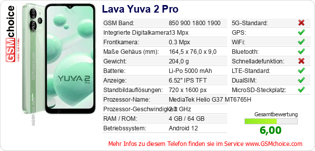 Hast du eigene Webseite? Willst du die Informationen über Standarddaten des Handys Lava Yuva 2 Pro irgendwo veröffentlichen? Das ist sehr einfach. Du kannst das Bild herunterladen oder kopieren und auf der Webseite folgenden Code hinzufügen:Das Einfügen von diesem Code verursacht das Anzeigen von dem folgenden Bild: