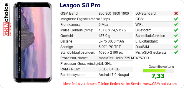 Hast du eigene Webseite? Willst du die Informationen über Standarddaten des Handys Leagoo S8 Pro irgendwo veröffentlichen? Das ist sehr einfach. Du kannst das Bild herunterladen oder kopieren und auf der Webseite folgenden Code hinzufügen:Das Einfügen von diesem Code verursacht das Anzeigen von dem folgenden Bild: