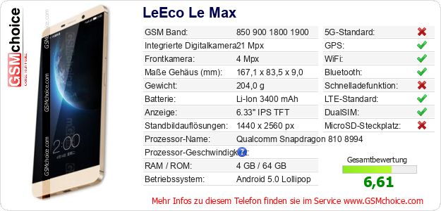 Hast du eigene Webseite? Willst du die Informationen über Standarddaten des Handys LeEco Le Max irgendwo veröffentlichen? Das ist sehr einfach. Du kannst das Bild herunterladen oder kopieren und auf der Webseite folgenden Code hinzufügen:Das Einfügen von diesem Code verursacht das Anzeigen von dem folgenden Bild: