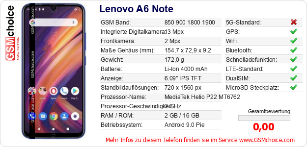 Hast du eigene Webseite? Willst du die Informationen über Standarddaten des Handys Lenovo A6 Note irgendwo veröffentlichen? Das ist sehr einfach. Du kannst das Bild herunterladen oder kopieren und auf der Webseite folgenden Code hinzufügen:Das Einfügen von diesem Code verursacht das Anzeigen von dem folgenden Bild: