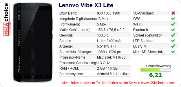 Hast du eigene Webseite? Willst du die Informationen über Standarddaten des Handys Lenovo Vibe X3 Lite irgendwo veröffentlichen? Das ist sehr einfach. Du kannst das Bild herunterladen oder kopieren und auf der Webseite folgenden Code hinzufügen:Das Einfügen von diesem Code verursacht das Anzeigen von dem folgenden Bild: