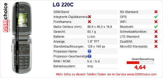 Hast du eigene Webseite? Willst du die Informationen über Standarddaten des Handys LG 220C irgendwo veröffentlichen? Das ist sehr einfach. Du kannst das Bild herunterladen oder kopieren und auf der Webseite folgenden Code hinzufügen:Das Einfügen von diesem Code verursacht das Anzeigen von dem folgenden Bild: