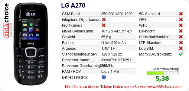 Hast du eigene Webseite? Willst du die Informationen über Standarddaten des Handys LG A270 irgendwo veröffentlichen? Das ist sehr einfach. Du kannst das Bild herunterladen oder kopieren und auf der Webseite folgenden Code hinzufügen:Das Einfügen von diesem Code verursacht das Anzeigen von dem folgenden Bild: