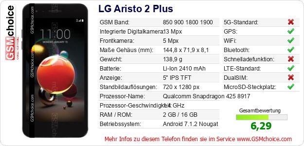 Hast du eigene Webseite? Willst du die Informationen über Standarddaten des Handys LG Aristo 2 Plus irgendwo veröffentlichen? Das ist sehr einfach. Du kannst das Bild herunterladen oder kopieren und auf der Webseite folgenden Code hinzufügen:Das Einfügen von diesem Code verursacht das Anzeigen von dem folgenden Bild: