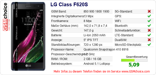 Hast du eigene Webseite? Willst du die Informationen über Standarddaten des Handys LG Class F620S irgendwo veröffentlichen? Das ist sehr einfach. Du kannst das Bild herunterladen oder kopieren und auf der Webseite folgenden Code hinzufügen:Das Einfügen von diesem Code verursacht das Anzeigen von dem folgenden Bild: