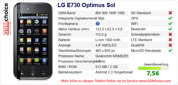 Daten des Mobiltelefons LG E730 Optimus Sol auf Ihrer Seite