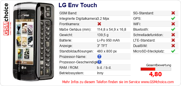 Hast du eigene Webseite? Willst du die Informationen über Standarddaten des Handys LG Env Touch irgendwo veröffentlichen? Das ist sehr einfach. Du kannst das Bild herunterladen oder kopieren und auf der Webseite folgenden Code hinzufügen:Das Einfügen von diesem Code verursacht das Anzeigen von dem folgenden Bild: