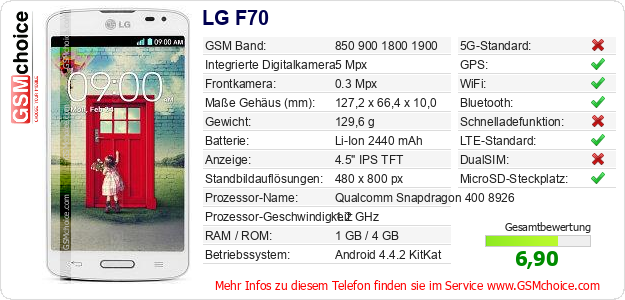 Hast du eigene Webseite? Willst du die Informationen über Standarddaten des Handys LG F70 irgendwo veröffentlichen? Das ist sehr einfach. Du kannst das Bild herunterladen oder kopieren und auf der Webseite folgenden Code hinzufügen:Das Einfügen von diesem Code verursacht das Anzeigen von dem folgenden Bild: