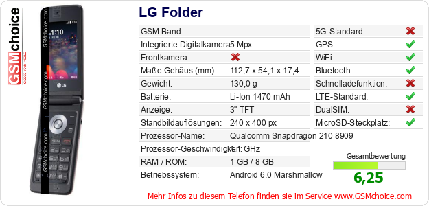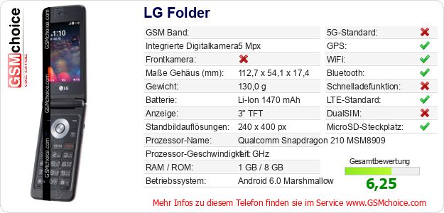 Hast du eigene Webseite? Willst du die Informationen über Standarddaten des Handys LG Folder irgendwo veröffentlichen? Das ist sehr einfach. Du kannst das Bild herunterladen oder kopieren und auf der Webseite folgenden Code hinzufügen:Das Einfügen von diesem Code verursacht das Anzeigen von dem folgenden Bild: