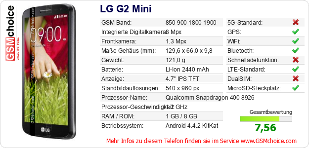 Hast du eigene Webseite? Willst du die Informationen über Standarddaten des Handys LG G2 Mini irgendwo veröffentlichen? Das ist sehr einfach. Du kannst das Bild herunterladen oder kopieren und auf der Webseite folgenden Code hinzufügen:Das Einfügen von diesem Code verursacht das Anzeigen von dem folgenden Bild: