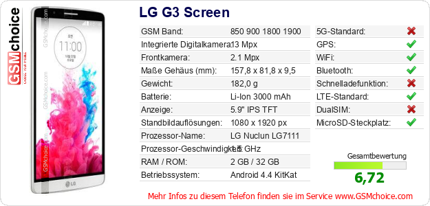 Hast du eigene Webseite? Willst du die Informationen über Standarddaten des Handys LG G3 Screen irgendwo veröffentlichen? Das ist sehr einfach. Du kannst das Bild herunterladen oder kopieren und auf der Webseite folgenden Code hinzufügen:Das Einfügen von diesem Code verursacht das Anzeigen von dem folgenden Bild: