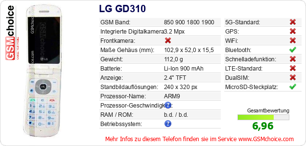 Hast du eigene Webseite? Willst du die Informationen über Standarddaten des Handys LG GD310 irgendwo veröffentlichen? Das ist sehr einfach. Du kannst das Bild herunterladen oder kopieren und auf der Webseite folgenden Code hinzufügen:Das Einfügen von diesem Code verursacht das Anzeigen von dem folgenden Bild: