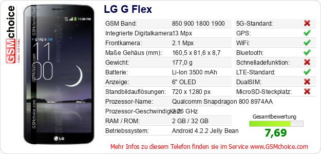 Hast du eigene Webseite? Willst du die Informationen über Standarddaten des Handys LG G Flex irgendwo veröffentlichen? Das ist sehr einfach. Du kannst das Bild herunterladen oder kopieren und auf der Webseite folgenden Code hinzufügen:Das Einfügen von diesem Code verursacht das Anzeigen von dem folgenden Bild: