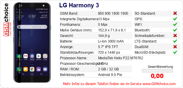 Hast du eigene Webseite? Willst du die Informationen über Standarddaten des Handys LG Harmony 3 irgendwo veröffentlichen? Das ist sehr einfach. Du kannst das Bild herunterladen oder kopieren und auf der Webseite folgenden Code hinzufügen:Das Einfügen von diesem Code verursacht das Anzeigen von dem folgenden Bild: