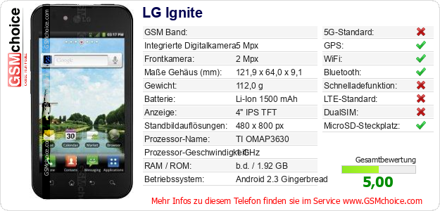 Hast du eigene Webseite? Willst du die Informationen über Standarddaten des Handys LG Ignite irgendwo veröffentlichen? Das ist sehr einfach. Du kannst das Bild herunterladen oder kopieren und auf der Webseite folgenden Code hinzufügen:Das Einfügen von diesem Code verursacht das Anzeigen von dem folgenden Bild: