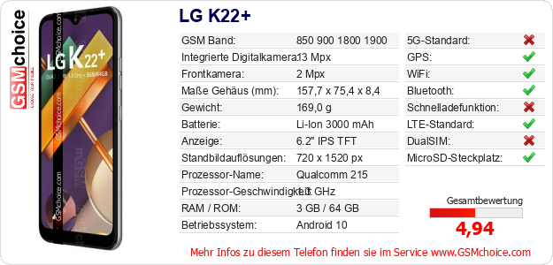 Hast du eigene Webseite? Willst du die Informationen über Standarddaten des Handys LG K22+ irgendwo veröffentlichen? Das ist sehr einfach. Du kannst das Bild herunterladen oder kopieren und auf der Webseite folgenden Code hinzufügen:Das Einfügen von diesem Code verursacht das Anzeigen von dem folgenden Bild: