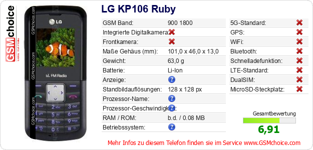 Hast du eigene Webseite? Willst du die Informationen über Standarddaten des Handys LG KP106 Ruby irgendwo veröffentlichen? Das ist sehr einfach. Du kannst das Bild herunterladen oder kopieren und auf der Webseite folgenden Code hinzufügen:Das Einfügen von diesem Code verursacht das Anzeigen von dem folgenden Bild: