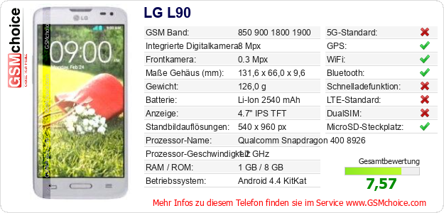 Hast du eigene Webseite? Willst du die Informationen über Standarddaten des Handys LG L90 irgendwo veröffentlichen? Das ist sehr einfach. Du kannst das Bild herunterladen oder kopieren und auf der Webseite folgenden Code hinzufügen:Das Einfügen von diesem Code verursacht das Anzeigen von dem folgenden Bild: