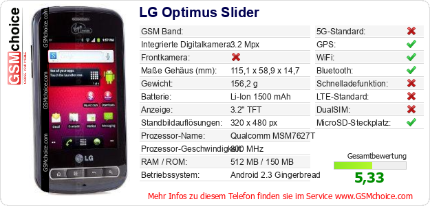 Hast du eigene Webseite? Willst du die Informationen über Standarddaten des Handys LG Optimus Slider irgendwo veröffentlichen? Das ist sehr einfach. Du kannst das Bild herunterladen oder kopieren und auf der Webseite folgenden Code hinzufügen:Das Einfügen von diesem Code verursacht das Anzeigen von dem folgenden Bild: