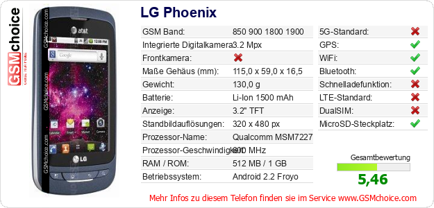 Hast du eigene Webseite? Willst du die Informationen über Standarddaten des Handys LG Phoenix irgendwo veröffentlichen? Das ist sehr einfach. Du kannst das Bild herunterladen oder kopieren und auf der Webseite folgenden Code hinzufügen:Das Einfügen von diesem Code verursacht das Anzeigen von dem folgenden Bild: