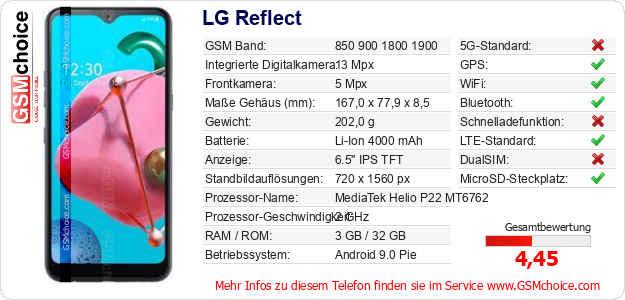 Hast du eigene Webseite? Willst du die Informationen über Standarddaten des Handys LG Reflect irgendwo veröffentlichen? Das ist sehr einfach. Du kannst das Bild herunterladen oder kopieren und auf der Webseite folgenden Code hinzufügen:Das Einfügen von diesem Code verursacht das Anzeigen von dem folgenden Bild: