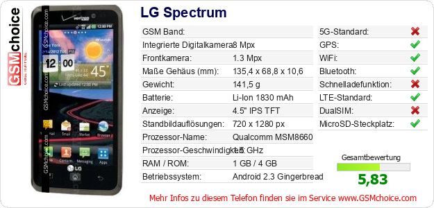 Hast du eigene Webseite? Willst du die Informationen über Standarddaten des Handys LG Spectrum irgendwo veröffentlichen? Das ist sehr einfach. Du kannst das Bild herunterladen oder kopieren und auf der Webseite folgenden Code hinzufügen:Das Einfügen von diesem Code verursacht das Anzeigen von dem folgenden Bild: