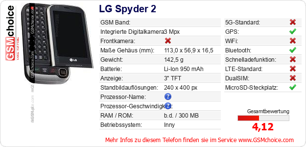 Hast du eigene Webseite? Willst du die Informationen über Standarddaten des Handys LG Spyder 2 irgendwo veröffentlichen? Das ist sehr einfach. Du kannst das Bild herunterladen oder kopieren und auf der Webseite folgenden Code hinzufügen:Das Einfügen von diesem Code verursacht das Anzeigen von dem folgenden Bild: