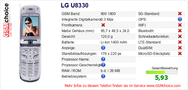 Hast du eigene Webseite? Willst du die Informationen über Standarddaten des Handys LG U8330 irgendwo veröffentlichen? Das ist sehr einfach. Du kannst das Bild herunterladen oder kopieren und auf der Webseite folgenden Code hinzufügen:Das Einfügen von diesem Code verursacht das Anzeigen von dem folgenden Bild: