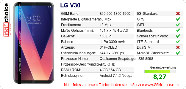 Hast du eigene Webseite? Willst du die Informationen über Standarddaten des Handys LG V30 irgendwo veröffentlichen? Das ist sehr einfach. Du kannst das Bild herunterladen oder kopieren und auf der Webseite folgenden Code hinzufügen:Das Einfügen von diesem Code verursacht das Anzeigen von dem folgenden Bild:
