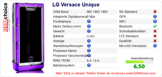 Hast du eigene Webseite? Willst du die Informationen über Standarddaten des Handys LG Versace Unique irgendwo veröffentlichen? Das ist sehr einfach. Du kannst das Bild herunterladen oder kopieren und auf der Webseite folgenden Code hinzufügen:Das Einfügen von diesem Code verursacht das Anzeigen von dem folgenden Bild: