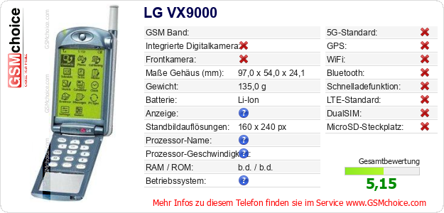 Hast du eigene Webseite? Willst du die Informationen über Standarddaten des Handys LG VX9000 irgendwo veröffentlichen? Das ist sehr einfach. Du kannst das Bild herunterladen oder kopieren und auf der Webseite folgenden Code hinzufügen:Das Einfügen von diesem Code verursacht das Anzeigen von dem folgenden Bild: