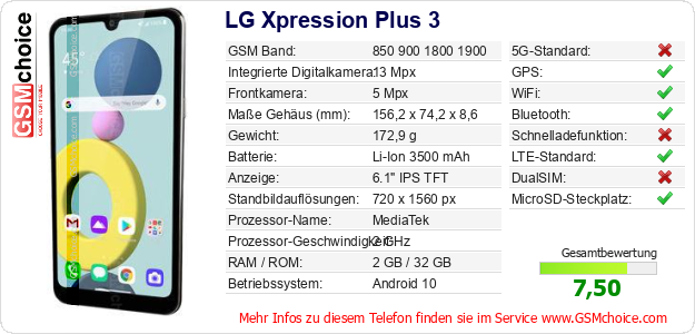 Hast du eigene Webseite? Willst du die Informationen über Standarddaten des Handys LG Xpression Plus 3 irgendwo veröffentlichen? Das ist sehr einfach. Du kannst das Bild herunterladen oder kopieren und auf der Webseite folgenden Code hinzufügen:Das Einfügen von diesem Code verursacht das Anzeigen von dem folgenden Bild: