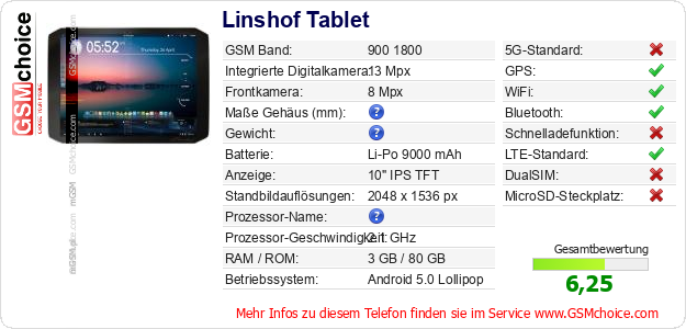 Hast du eigene Webseite? Willst du die Informationen über Standarddaten des Handys Linshof Tablet irgendwo veröffentlichen? Das ist sehr einfach. Du kannst das Bild herunterladen oder kopieren und auf der Webseite folgenden Code hinzufügen:Das Einfügen von diesem Code verursacht das Anzeigen von dem folgenden Bild:
