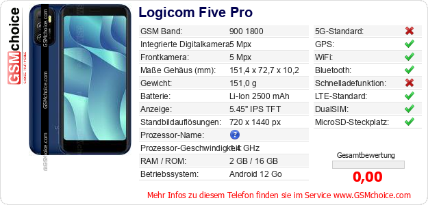Hast du eigene Webseite? Willst du die Informationen über Standarddaten des Handys Logicom Five Pro irgendwo veröffentlichen? Das ist sehr einfach. Du kannst das Bild herunterladen oder kopieren und auf der Webseite folgenden Code hinzufügen:Das Einfügen von diesem Code verursacht das Anzeigen von dem folgenden Bild: