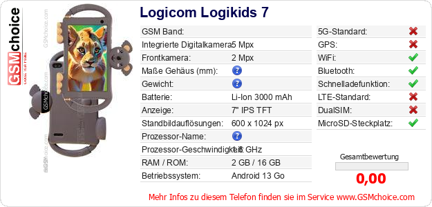 Hast du eigene Webseite? Willst du die Informationen über Standarddaten des Handys Logicom Logikids 7 irgendwo veröffentlichen? Das ist sehr einfach. Du kannst das Bild herunterladen oder kopieren und auf der Webseite folgenden Code hinzufügen:Das Einfügen von diesem Code verursacht das Anzeigen von dem folgenden Bild: