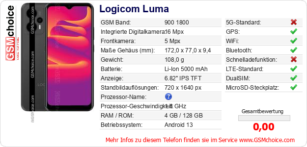 Hast du eigene Webseite? Willst du die Informationen über Standarddaten des Handys Logicom Luma irgendwo veröffentlichen? Das ist sehr einfach. Du kannst das Bild herunterladen oder kopieren und auf der Webseite folgenden Code hinzufügen:Das Einfügen von diesem Code verursacht das Anzeigen von dem folgenden Bild: