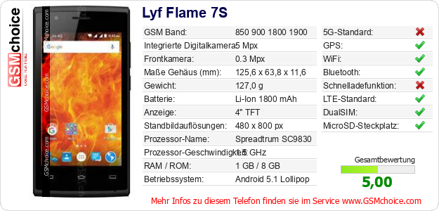 Hast du eigene Webseite? Willst du die Informationen über Standarddaten des Handys Lyf Flame 7S irgendwo veröffentlichen? Das ist sehr einfach. Du kannst das Bild herunterladen oder kopieren und auf der Webseite folgenden Code hinzufügen:Das Einfügen von diesem Code verursacht das Anzeigen von dem folgenden Bild: