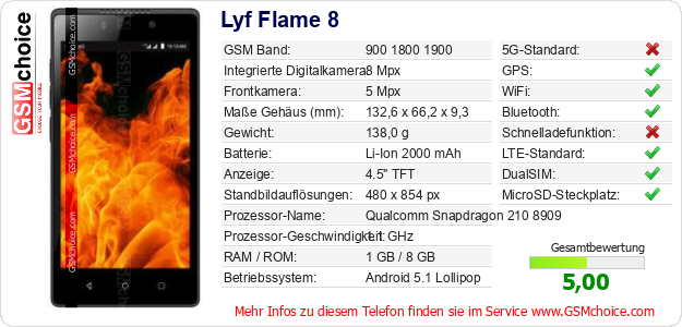 Hast du eigene Webseite? Willst du die Informationen über Standarddaten des Handys Lyf Flame 8 irgendwo veröffentlichen? Das ist sehr einfach. Du kannst das Bild herunterladen oder kopieren und auf der Webseite folgenden Code hinzufügen:Das Einfügen von diesem Code verursacht das Anzeigen von dem folgenden Bild: